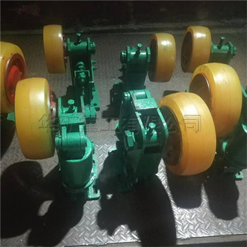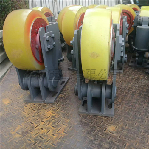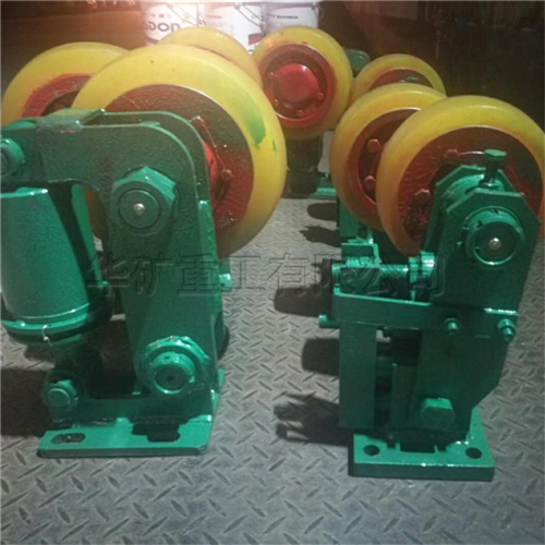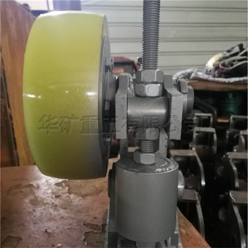 滾輪罐耳用于礦山提升容器的導(dǎo)向緩沖,本產(chǎn)品采用先進(jìn)的密封技術(shù),順應(yīng)淋水、煤塵等惡劣環(huán)境。輪頭安裝采用三鎖緊結(jié)構(gòu),徹底避免掉輪頭事故的發(fā)生。滾輪采用四氫呋喃-環(huán)氧丙烷共聚醚型聚氨酯澆注,具有高彈性、耐扯破、抗水性、抗油性的優(yōu)點(diǎn)。滾輪磨損補(bǔ)償調(diào)節(jié)采用左、右旋螺桿,調(diào)節(jié)迅速便捷。機(jī)座、擺架采用優(yōu)質(zhì)鋼板焊接成型,體積小、重量輕,安裝輕便。滾輪罐耳主要由輪軸、支架、緩沖裝置、底座等組成。